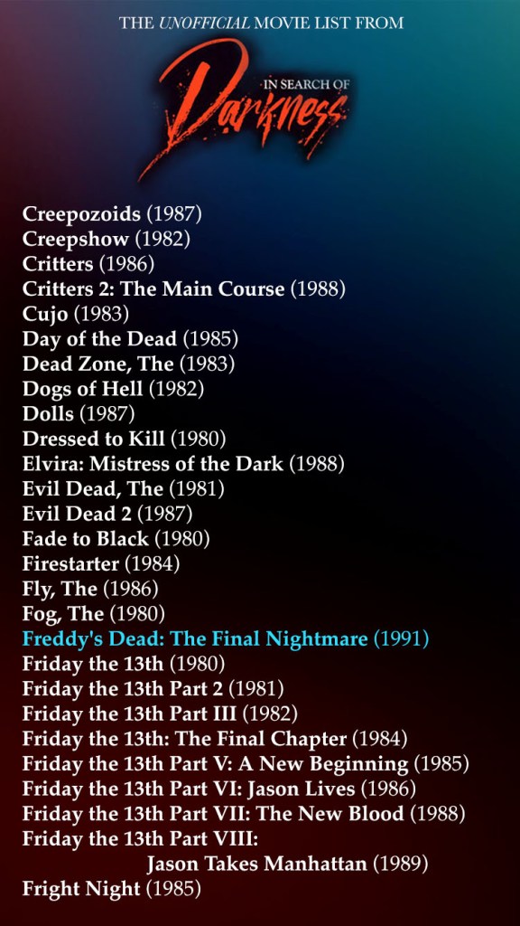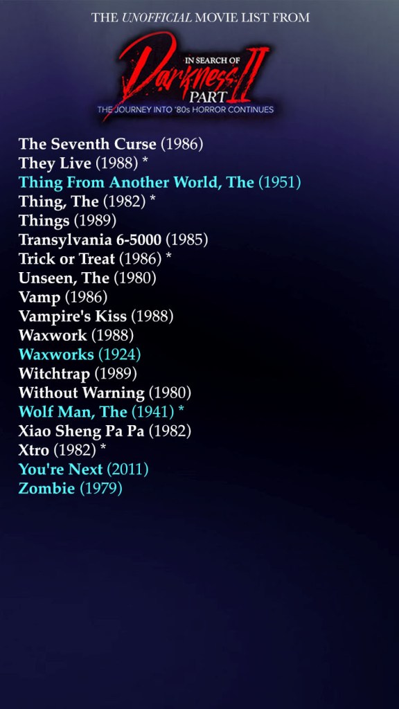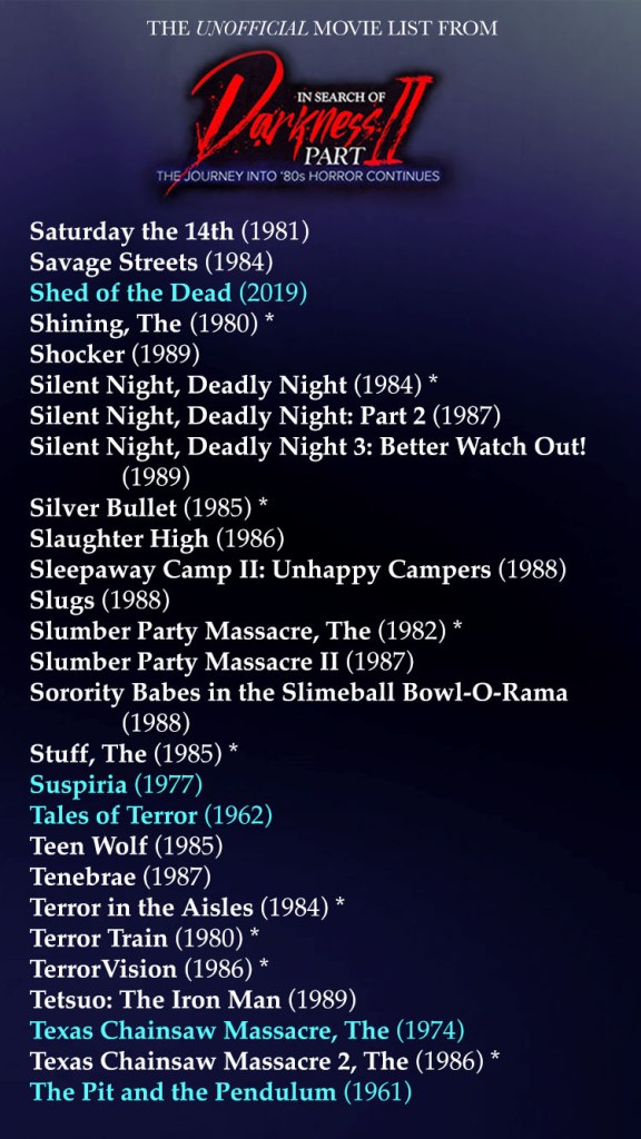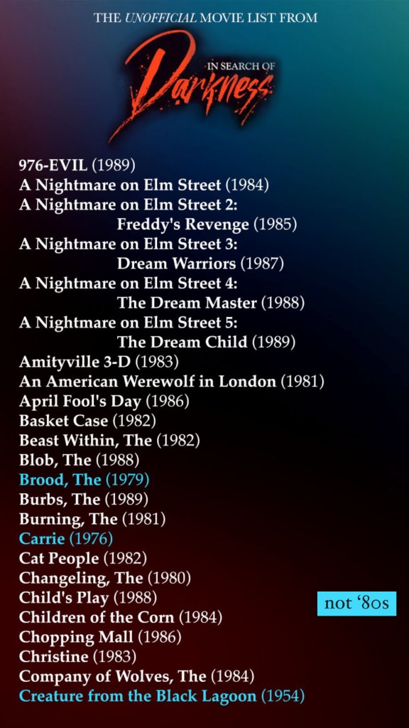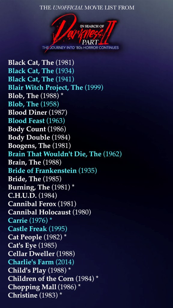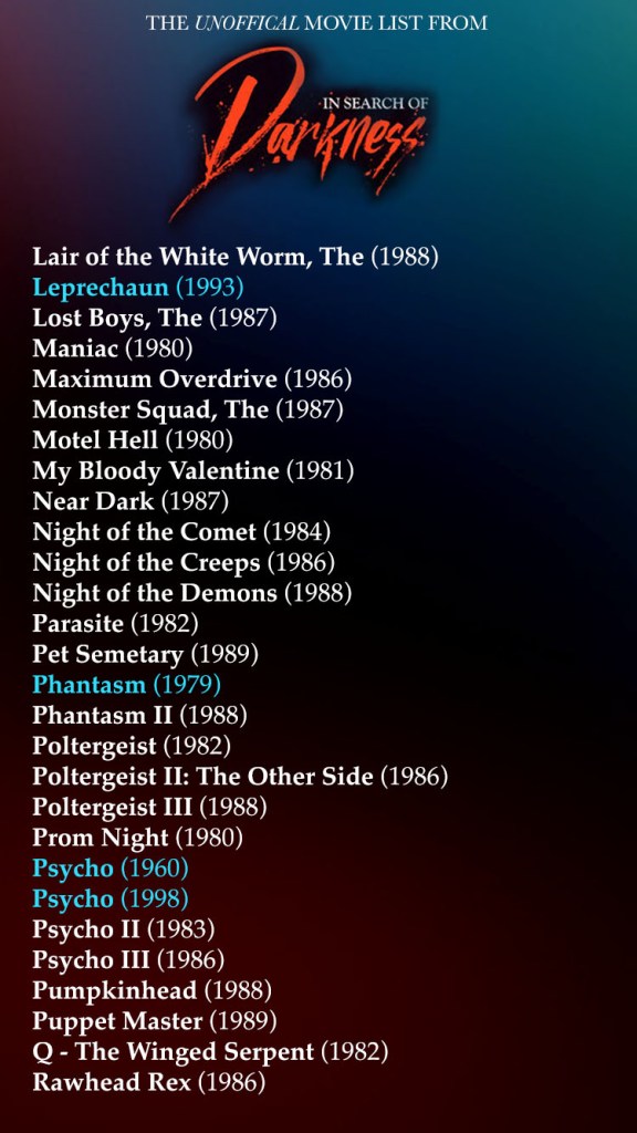 In Search Of Darkness II is now on Shudder and if you’re like me, maybe you wanted a list of every movie mentioned in parts one and two. So here’s a gorgeously put together syllabus courtesy of my very organized and wonderful friend @TheDezz !